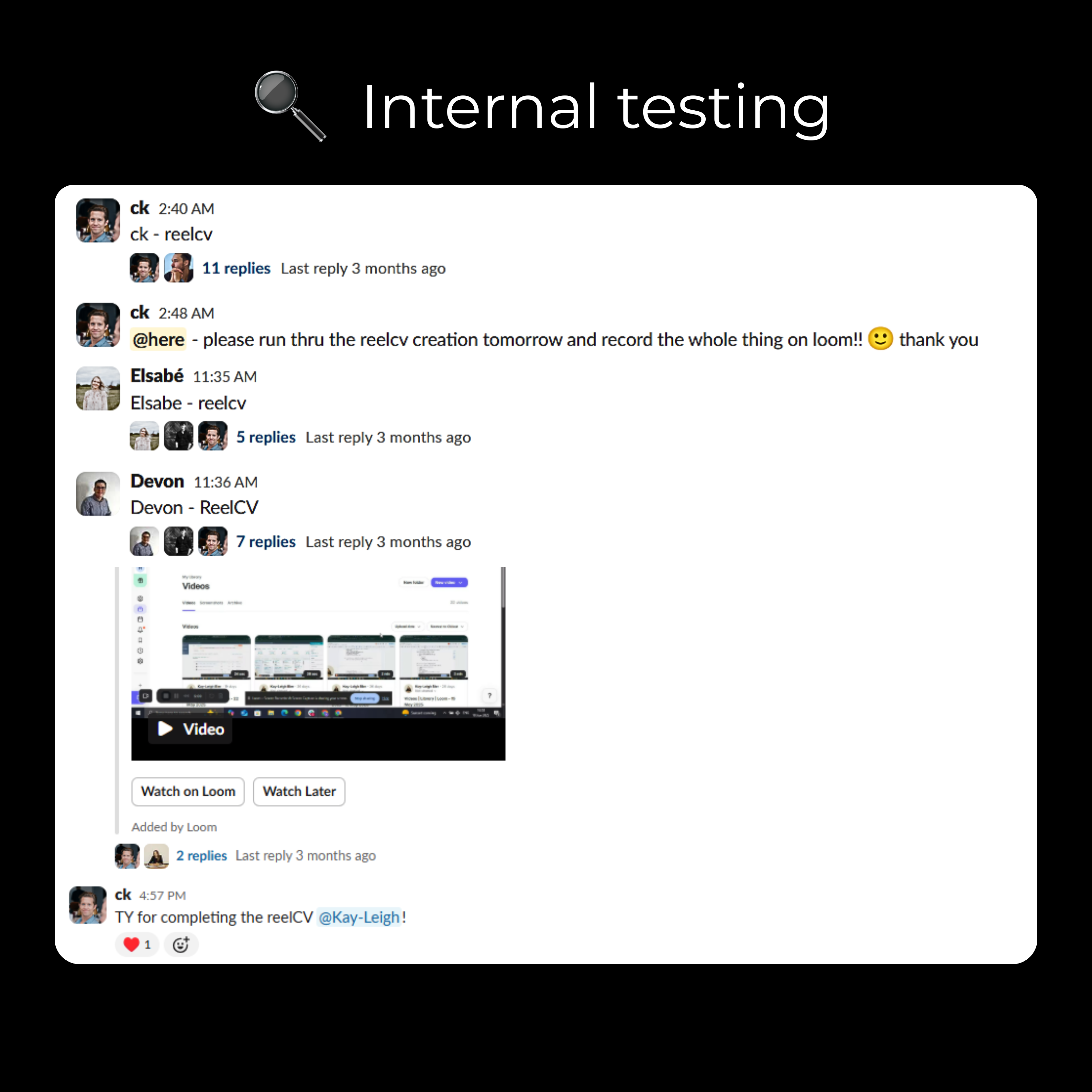 With so many core features working, May also marked the start of internal sign-up testing. Members of the Hirexe team created their own profiles, uploading CVs, recording videos, and stepping into the shoes of future users. Feedback was shared openly in Slack, often captured in quick videos or notes. These test runs revealed pain points, validated design choices, and built confidence that ReelCV was ready for wider trials.