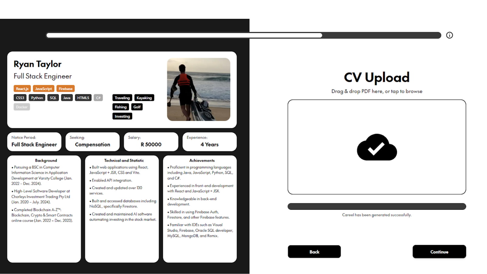 Another milestone was enabling a functional CV upload with live data. For the first time, the system could parse, process, and store actual candidate CVs, a leap forward from placeholders and test data.