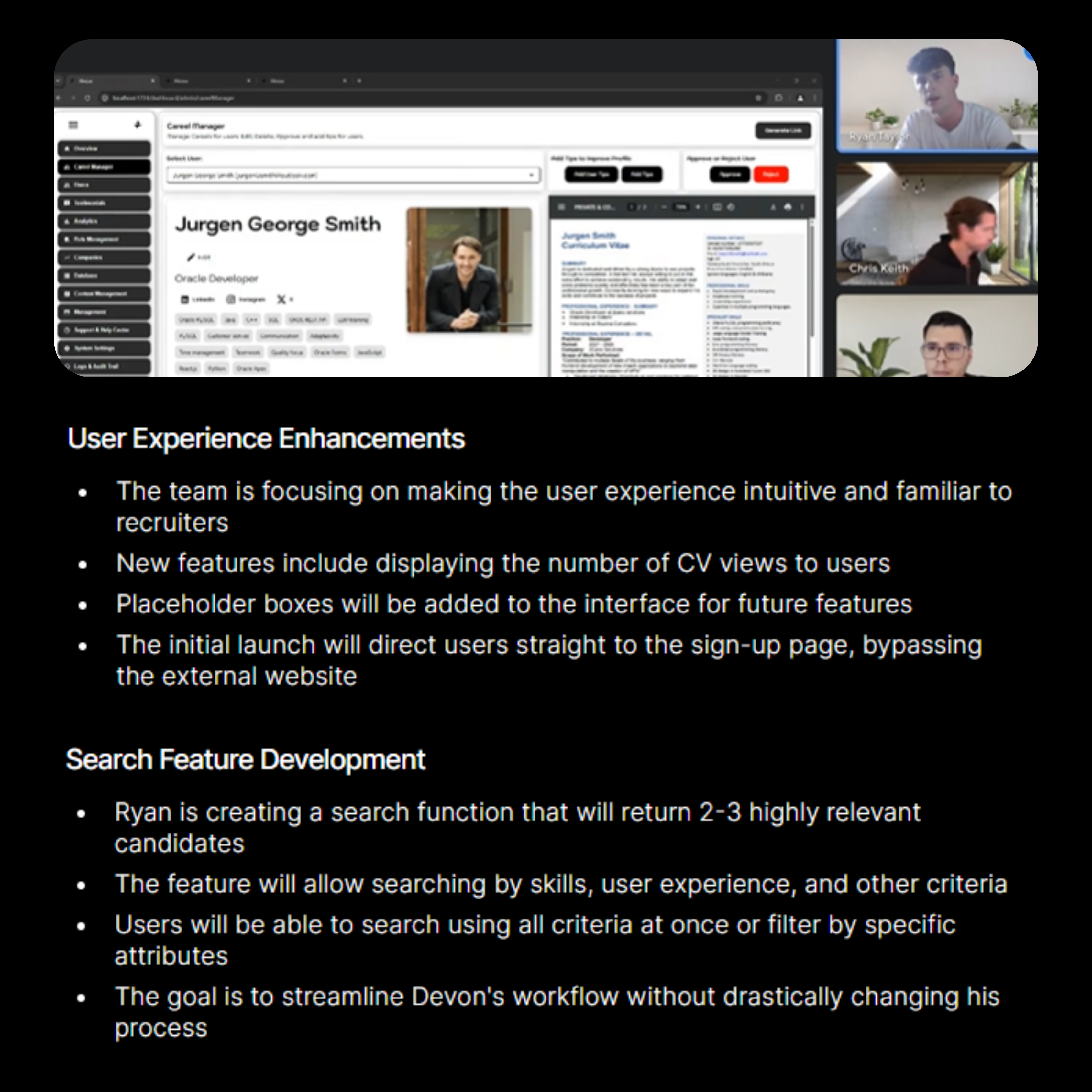 By the end of May, Ryan presented a walk-through of V2. The platform had moved far beyond its early wireframes: there was now a coherent candidate journey, from signup to video, from CV upload to recruiter-facing search and rating.