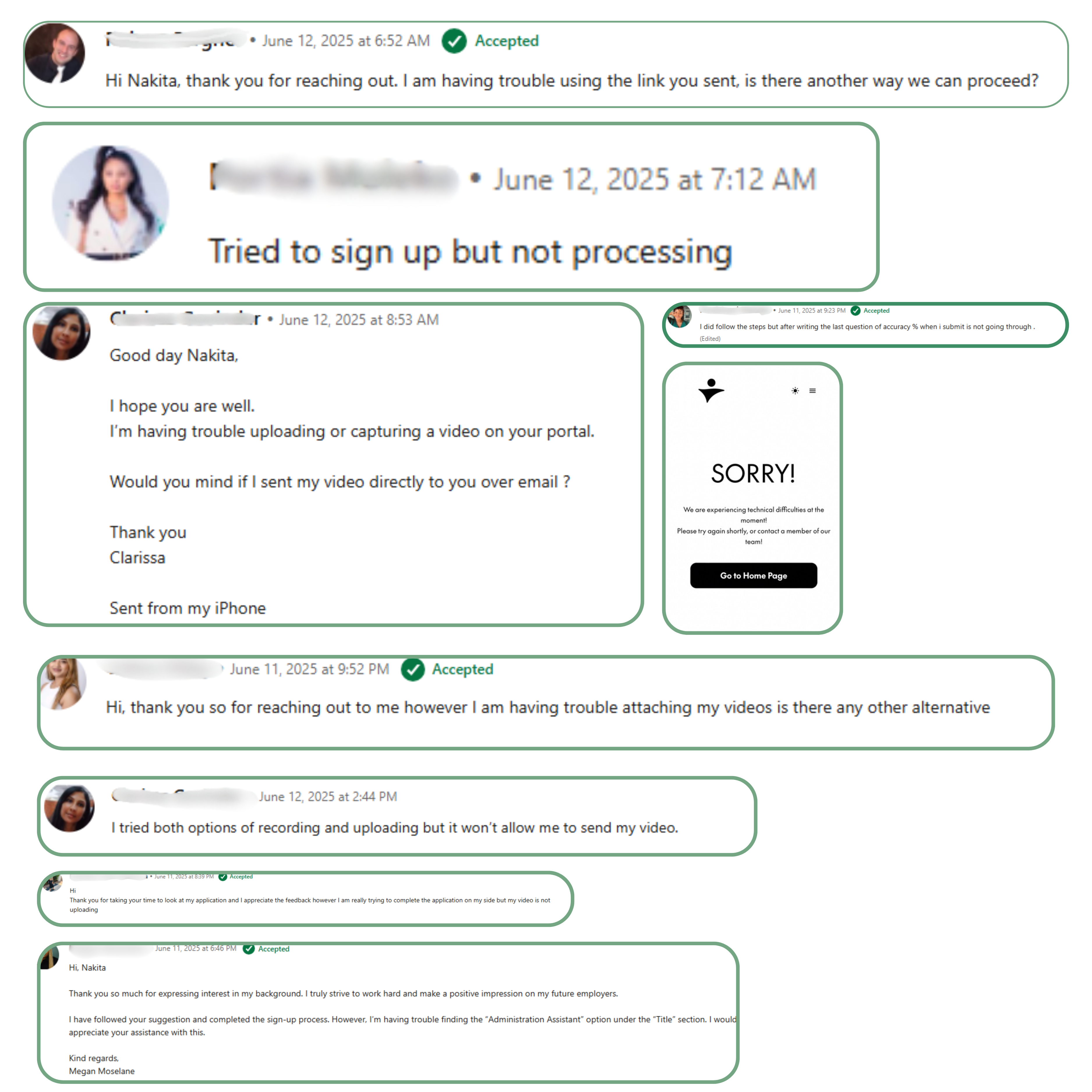 June also marked the first wave of external applicant reactions. A handful of candidates tried the new signup process, and their feedback — screenshots, notes, and direct comments — was captured and discussed by Ryan and Nakita in Slack. While not all reactions were glowing, the input was invaluable. It validated what was working while highlighting areas for improvement.